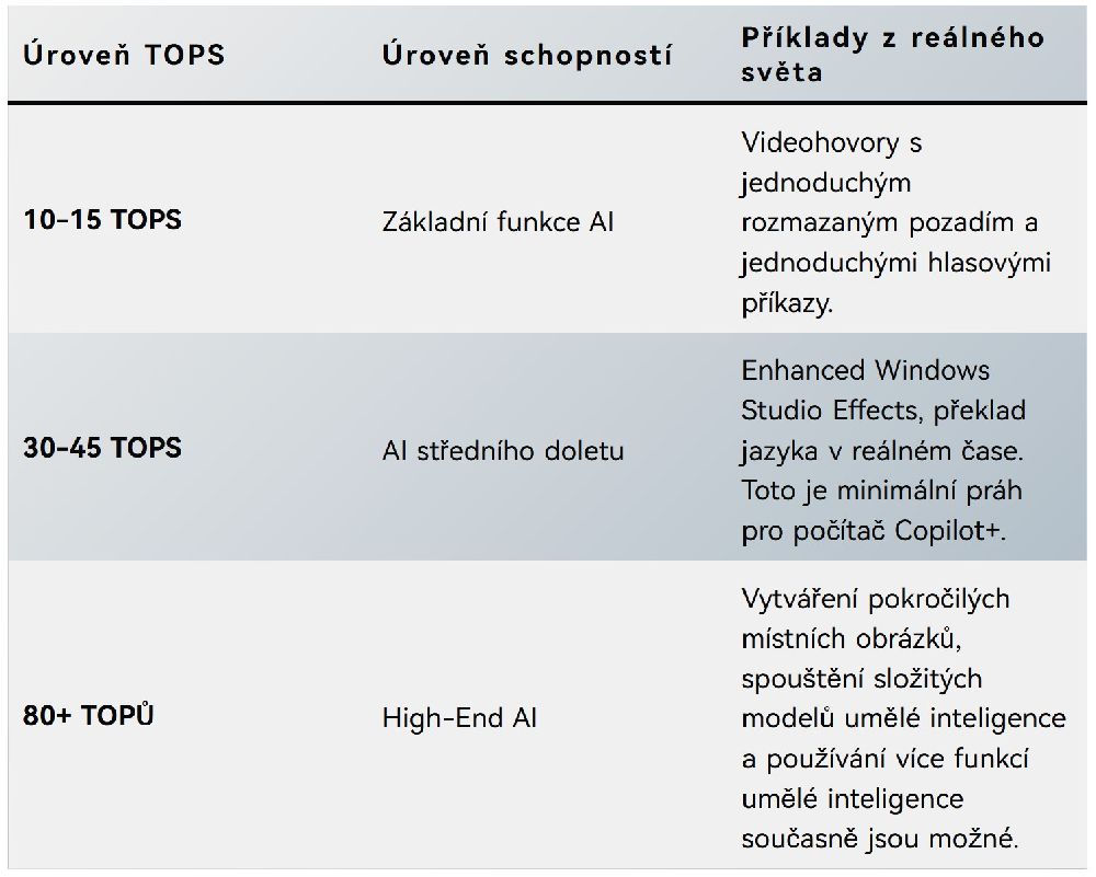 | Pro dnešní aplikace je 40 TOPS více než dostačující ke spuštění všech pokročilých funkcí Windows AI. Na druhou stranu umělá inteligence roste velmi rychlým tempem. |