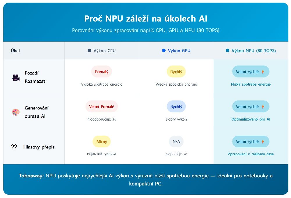 | Proč NPU ?. Pro lepší rychlost, soukromí a spolehlivost, když nejste online, se funkce umělé inteligence přesouvají z cloudu do vašeho místního zařízení. Chcete-li je spustit bez zpomalení počítače nebo vybití baterie, potřebujete vyhrazený procesor. Kvůli novým funkcím v operačních systémech, jako je Windows 11, dochází k tomuto posunu kvůli zrychlení NPU. Nejnovější procesory od velkých jmen jako AMD (řada Ryzen AI s architekturou XDNA), Intel (čipy Core Ultra) a Qualcomm (procesory Snapdragon mají všechny vestavěné NPU. |