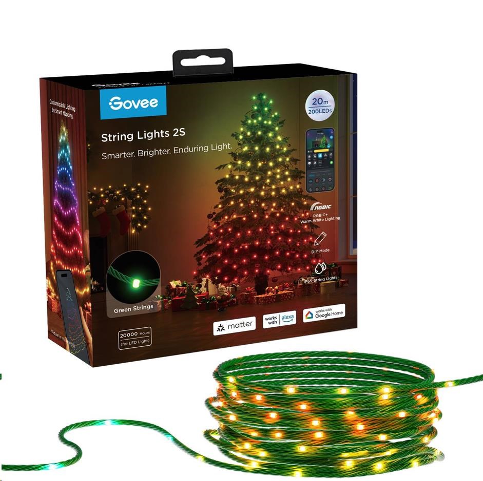 Govee Vánoční světelný řetěz o délce 20 metrů je ideální volbou pro všechny, kteří chtějí vytvořit dokonalou vánoční atmosféru doma i venku. Díky své délce pokryje tento řetěz větší plochy, ať už jde o vánoční stromek, plot, nebo jakoukoli jinou dekoraci. Vybavený pokročilou RGBICW technologií, umožňuje současně zobrazovat více barev na různých částech řetězu, což vytváří plynulé přechody a dynamické efekty, které vnesou do vašich svátečních dekorací život a kouzlo. Zásadní vlastností je možnost použití AI při generování vlastních scén pomocí hlasu, textu nebo obrázků.